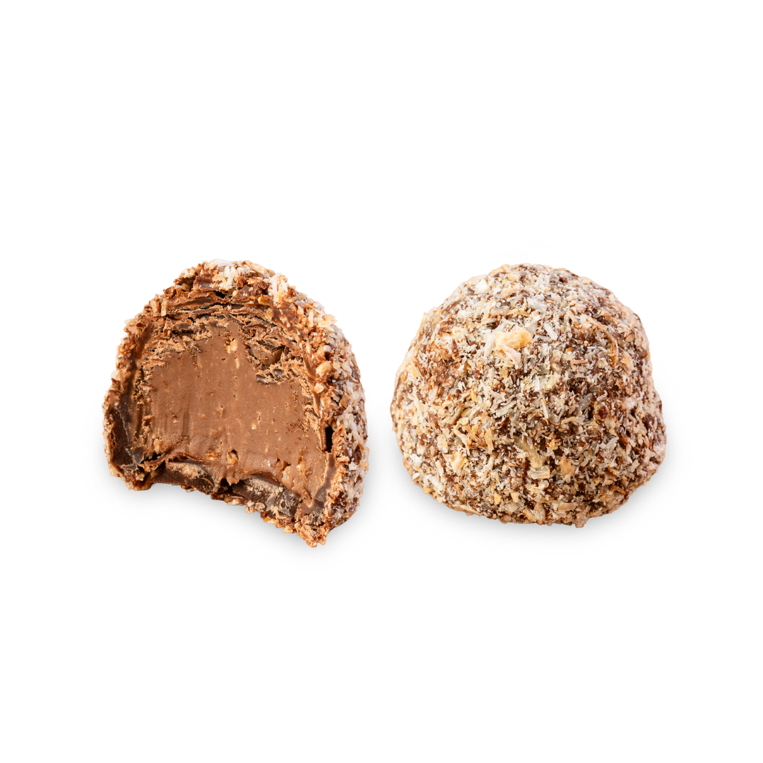 Le mariage exotique entre un cœur crémeux de Kâliner à la noix de coco torréfiée et un enrobage de chocolat noir, parsemé de copeaux de coco râpée pour une expérience riche et parfumée.